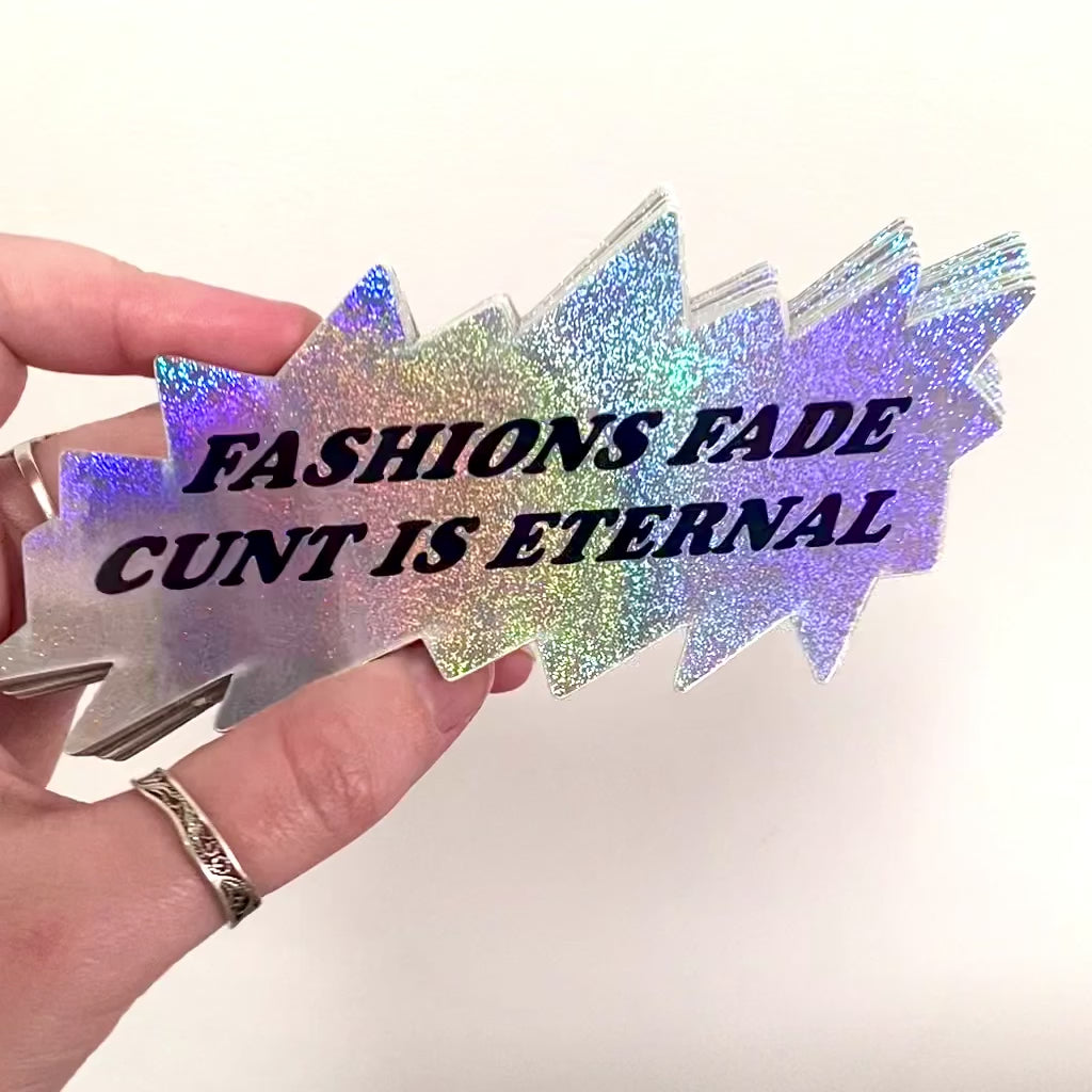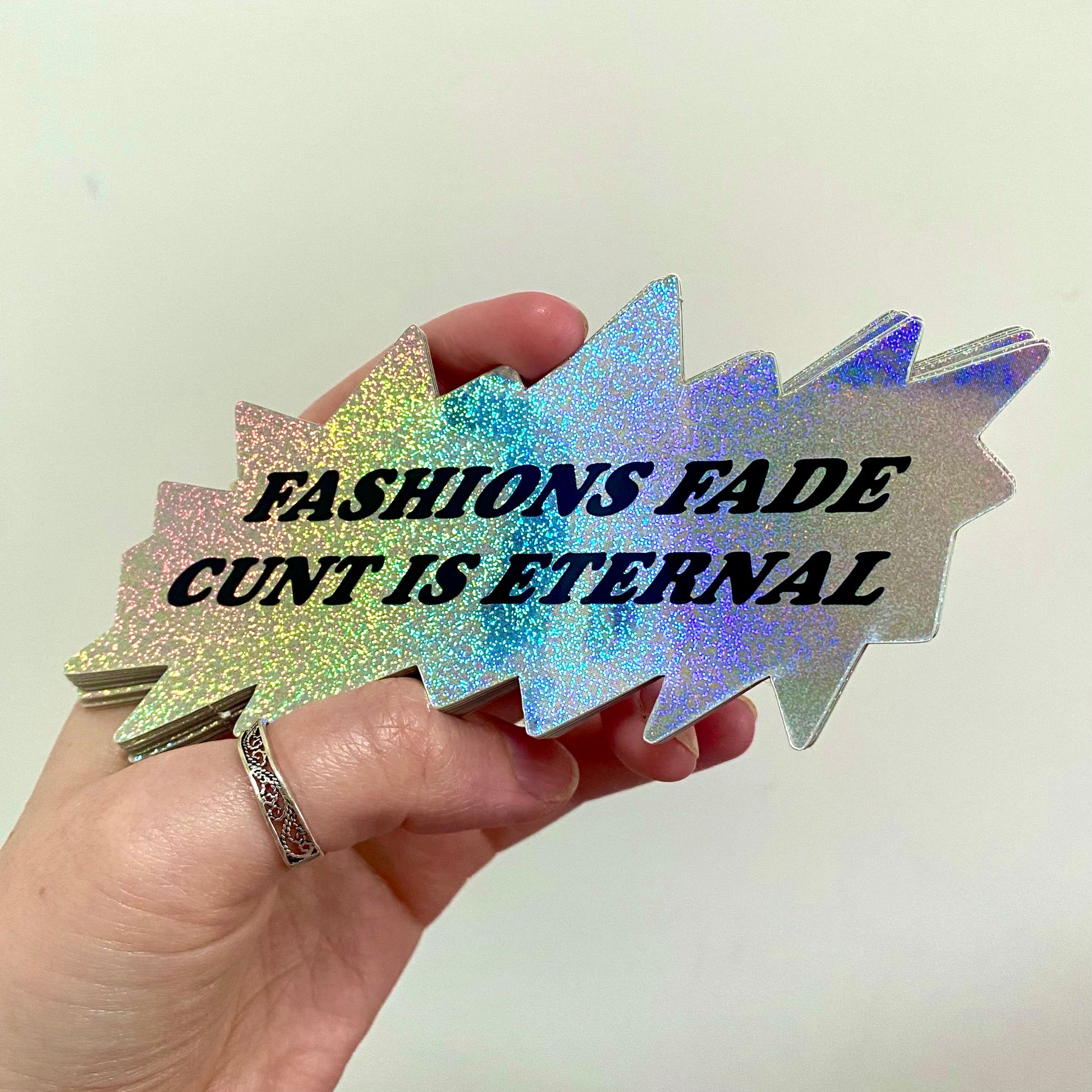 Durable holographic vinyl glitter sticker reading "fashions fade, cvnt is eternal".
