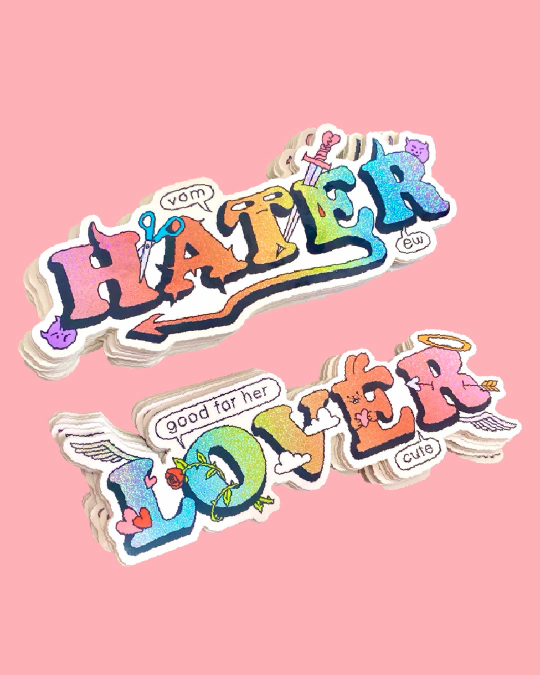 Two rainbow glitter stickers reading Hater and Lover for the two wolves that live inside of you.