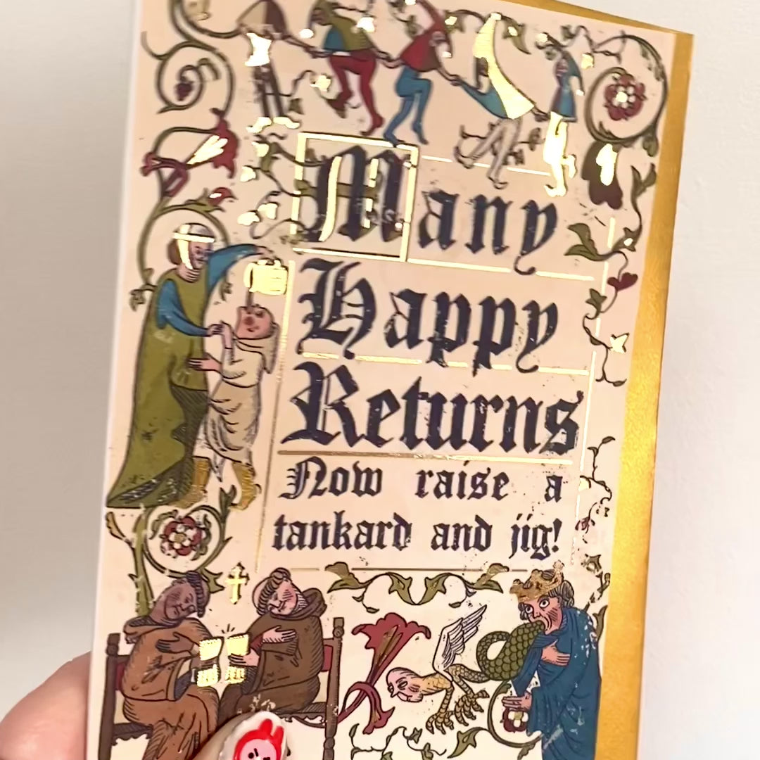 An A6 greetings card with gold foil detail on 300gsm card with a gold envelope. Design reads "Many Happy Returns, Now raise a tankard and jig!"