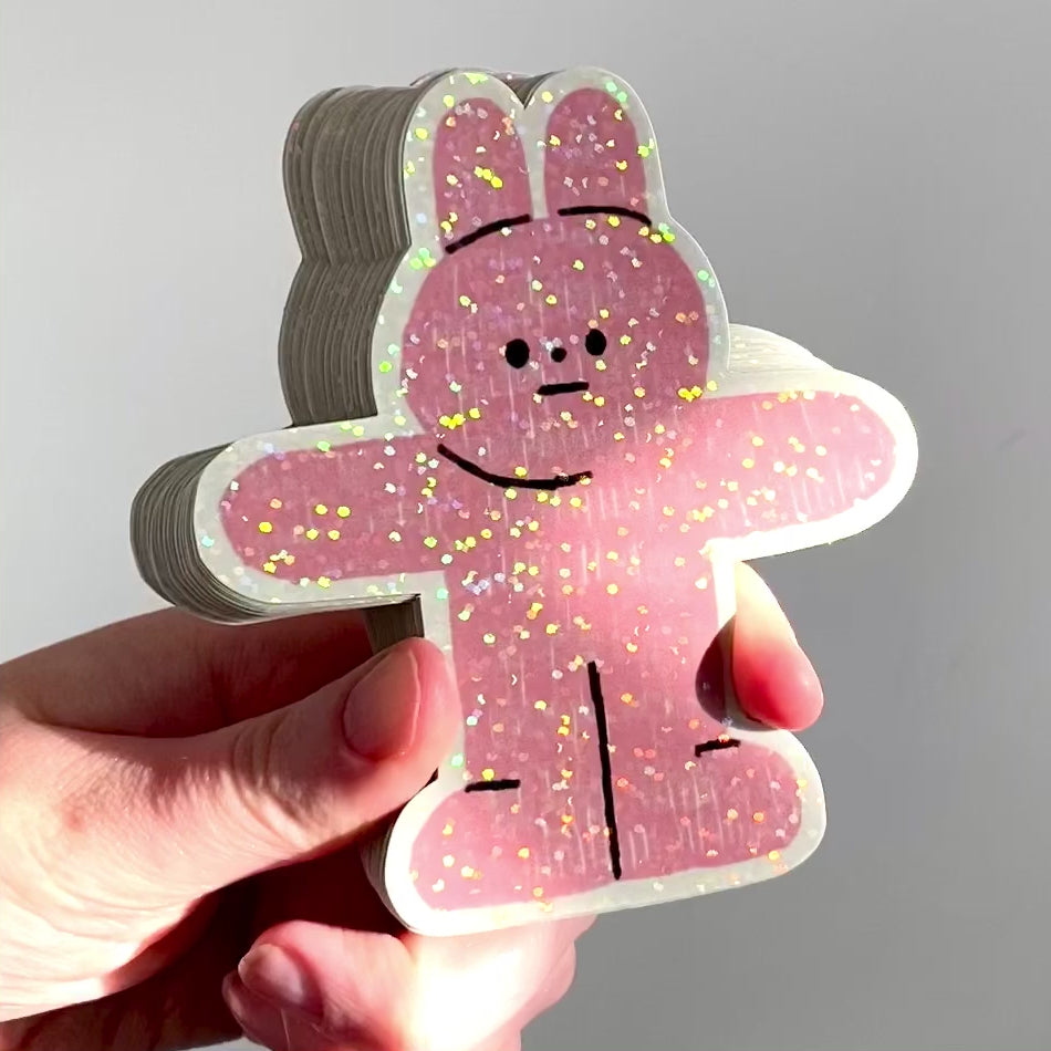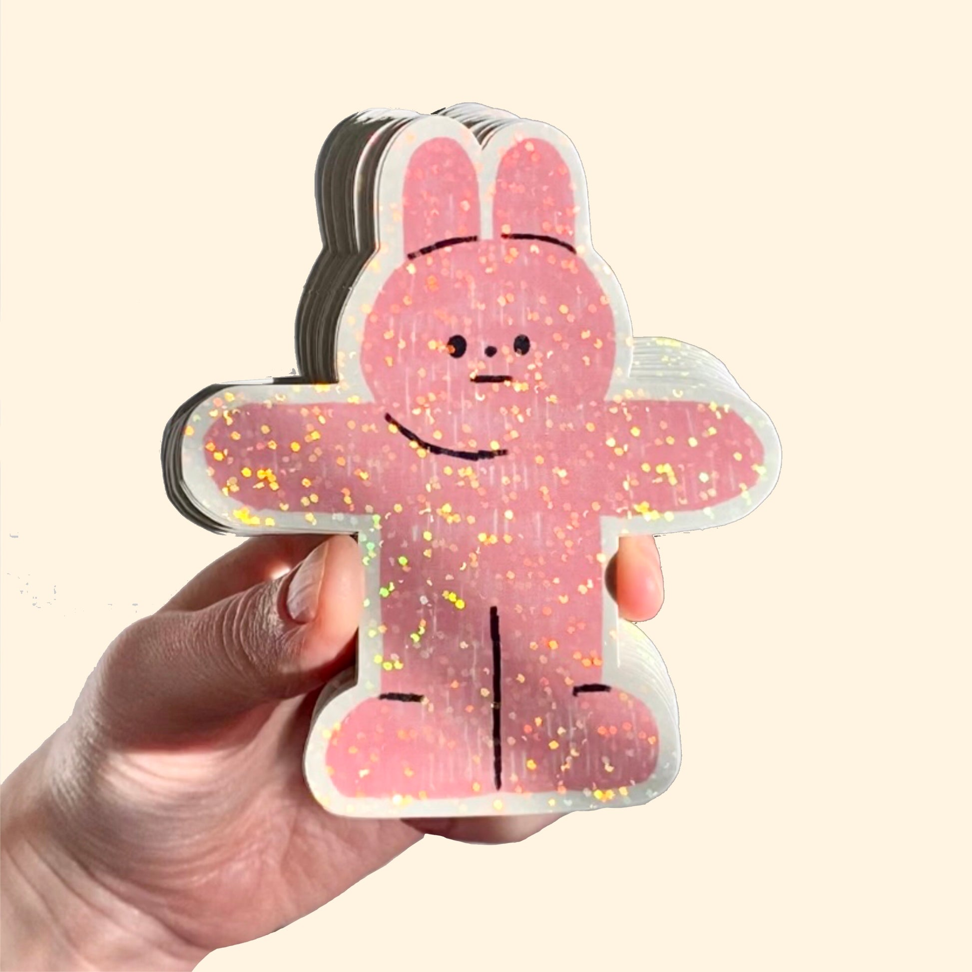 Durable rainbow glitter sticker vinyl sticker featuring a T-posing pink rabbit.