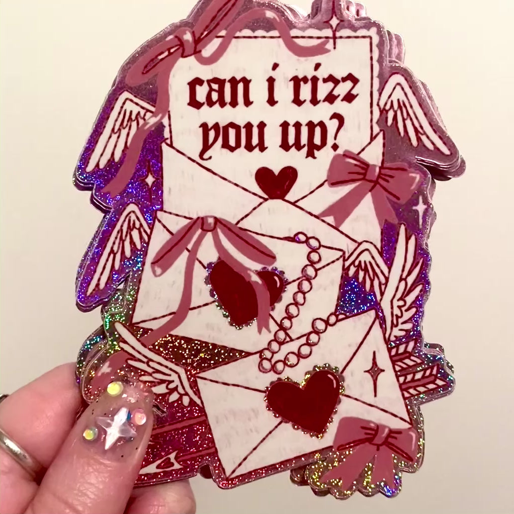 Durable with holographic, pink pixie-dust glitter vinyl sticker reading "Can I rizz you up?".