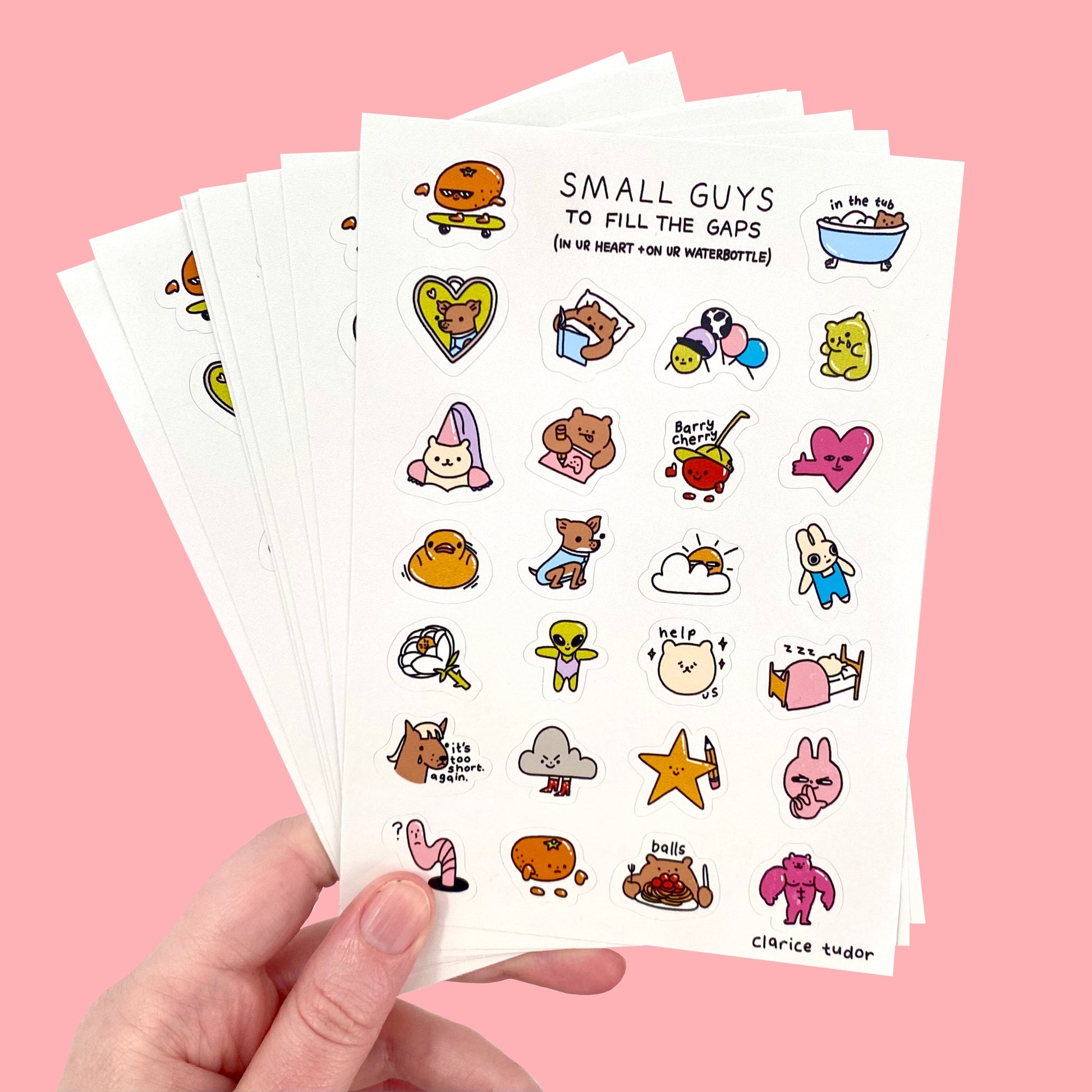 A sticker sheet featuring 26 durable vinyl stickers of small guys to fill the gaps (in ur heart and on ur waterbottle)