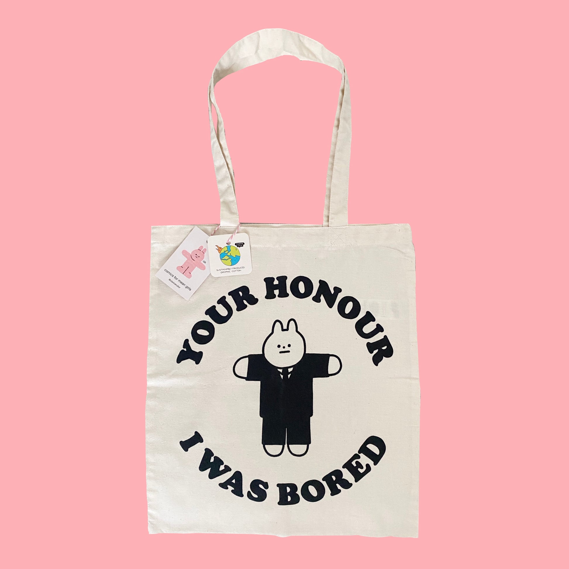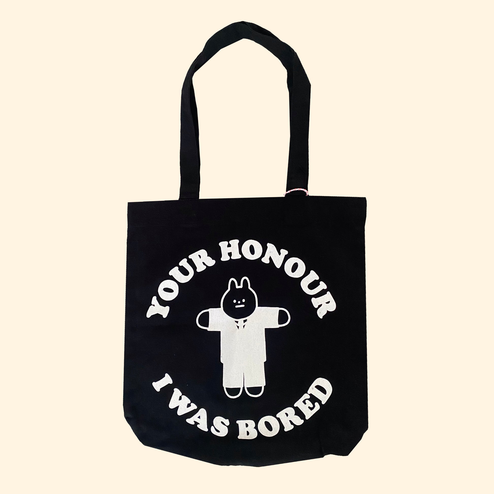 Screenprinted eco tote bags reading "your honour i was bored"